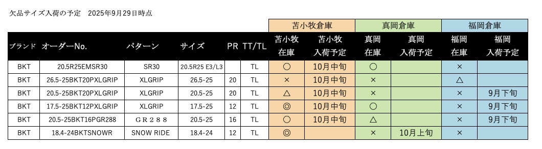 建機・重機タイヤ欠品サイズ入荷予定情報