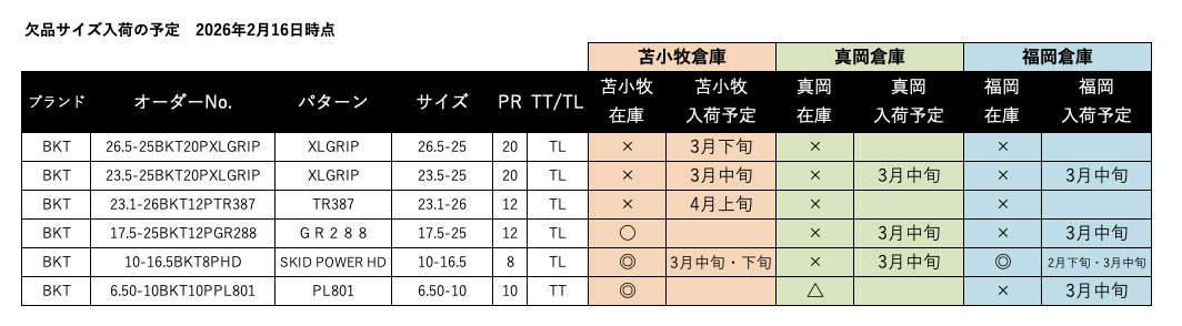 建機・重機タイヤ欠品サイズ入荷予定情報
